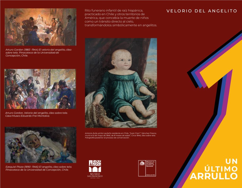 El tríptico aborda el velorio del angelito, un rito funerario infantil de origen hispánico, practicado en Chile y América, que concebía la muerte de niños como un tránsito directo al cielo. La muestra contextualiza histórica y culturalmente esta tradición y la vincula con representaciones artísticas del siglo XIX y comienzos del XX, destacando su dimensión simbólica, comunitaria y espiritual.