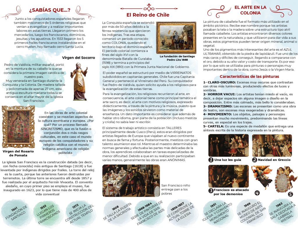 En este tríptico podrás encontrar una síntesis clara y didáctica del Museo San Francisco, su historia y sus colecciones. Presenta el contexto de la Conquista y la Colonia en Chile, el rol de las órdenes religiosas, especialmente la franciscana, y el uso del arte sacro como herramienta de evangelización, destacando conceptos clave como el sincretismo cultural y las principales características del arte colonial.