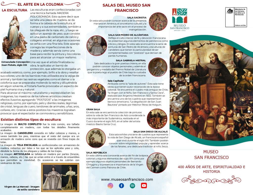 Además, el tríptico recorre la historia arquitectónica de la Iglesia y el Convento de San Francisco, pone en valor obras y piezas emblemáticas del museo y describe sus distintas salas, que reúnen más de 400 años de arte, espiritualidad e historia, incluyendo la colección sobre la vida de San Francisco de Asís y la sala dedicada a Gabriela Mistral